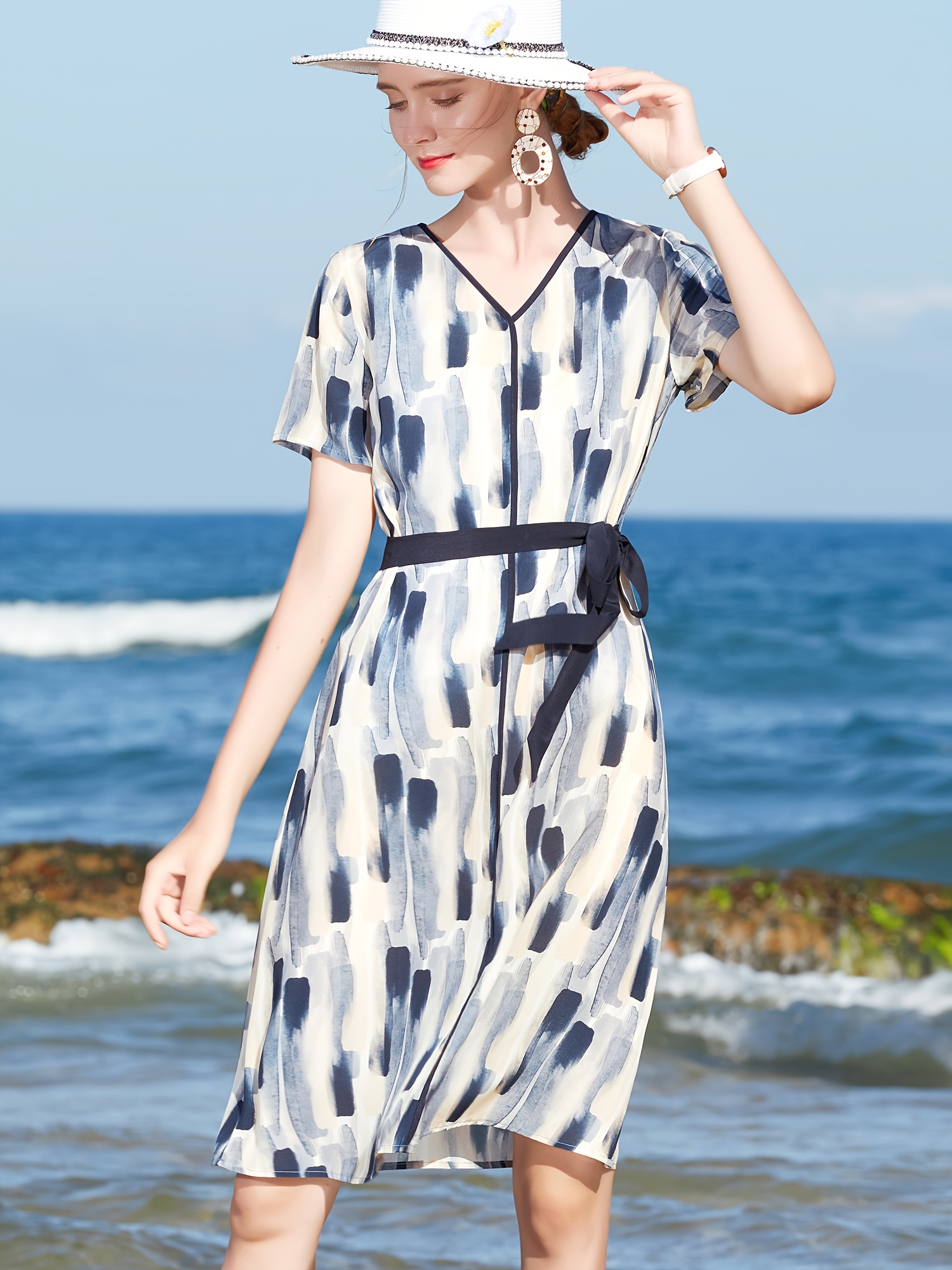 2025 New Women'S Floral Print Dress - Chic V-Neck, Short Sleeve, Waist-Cinching, Breathable