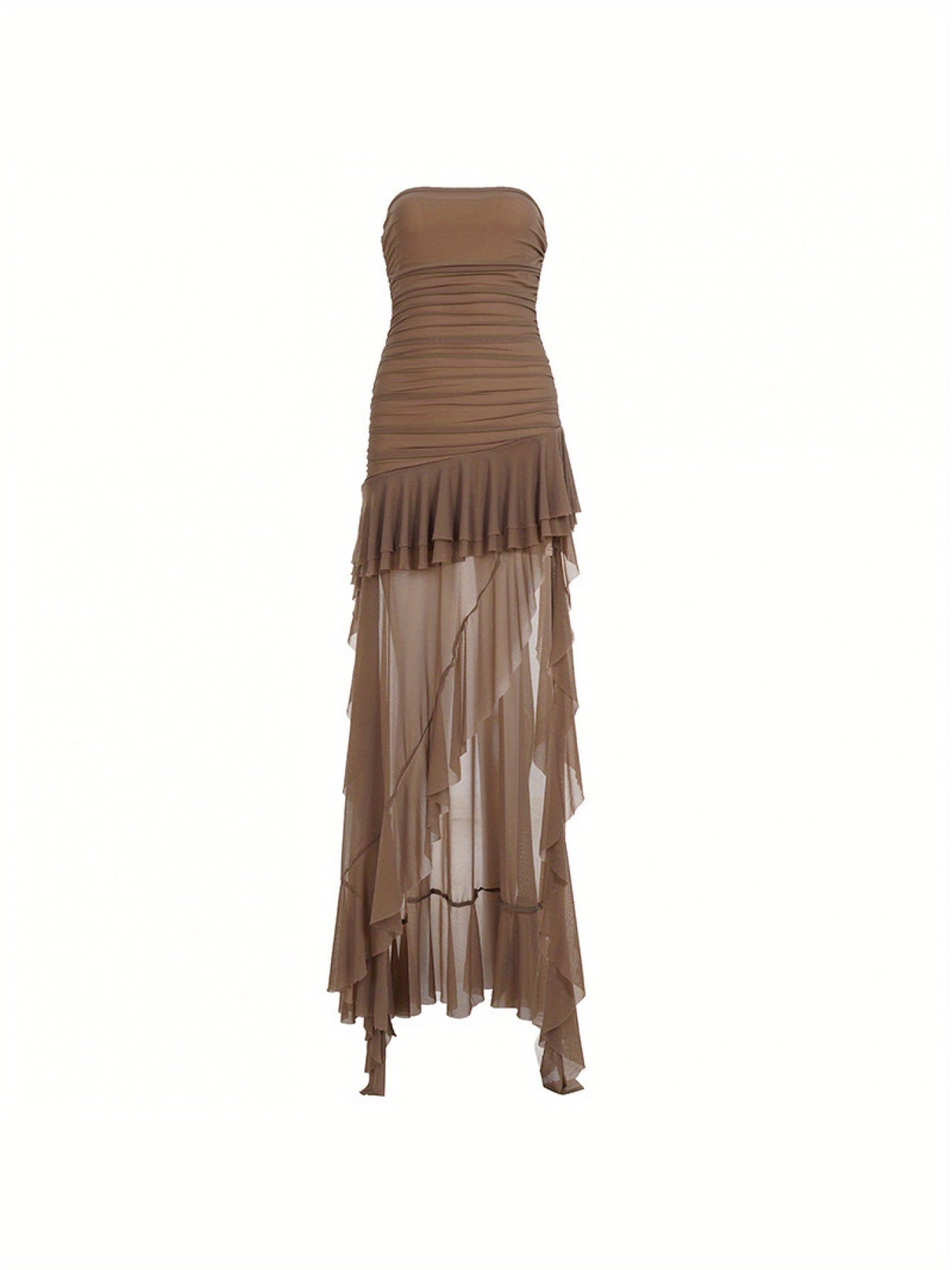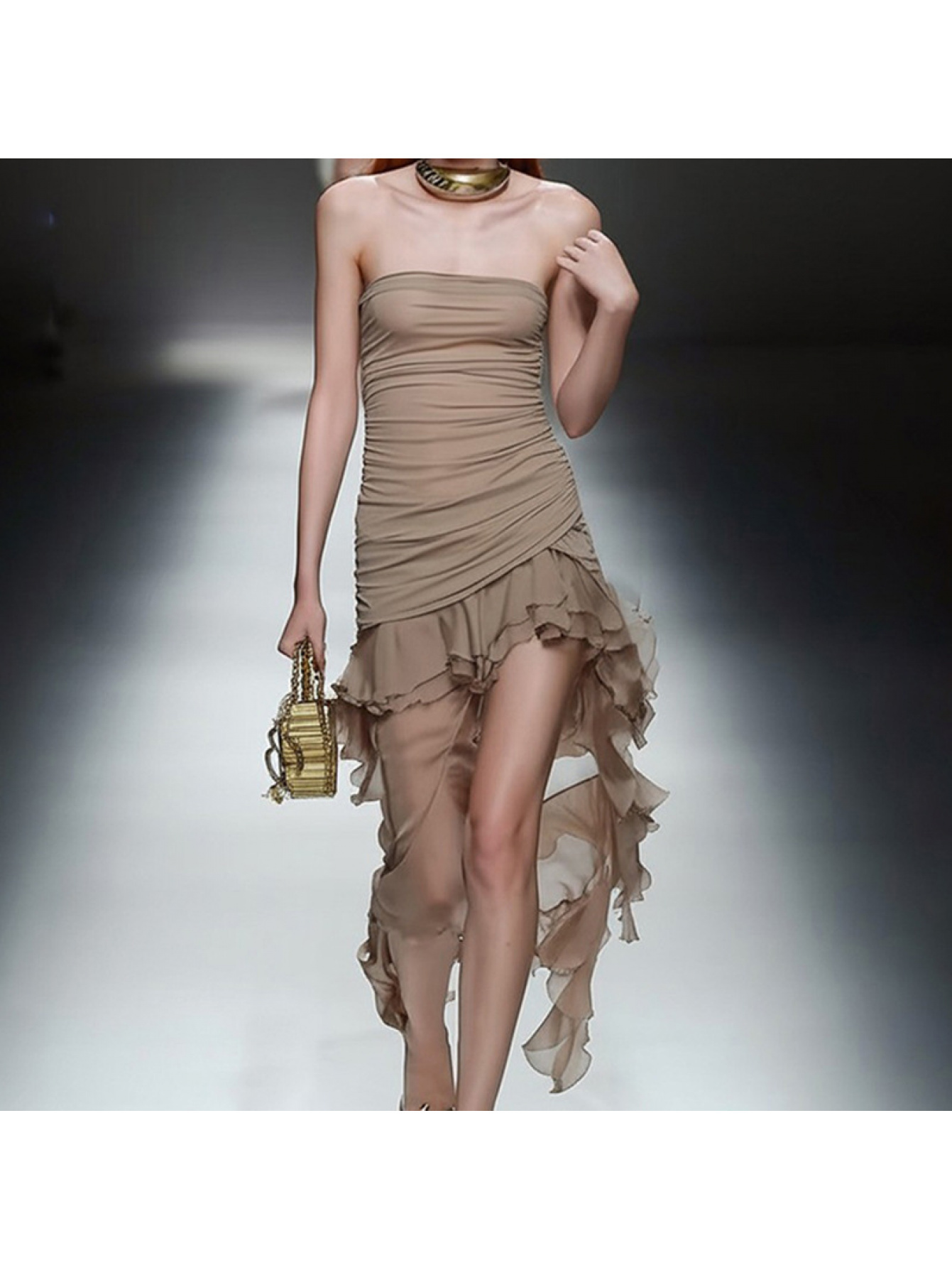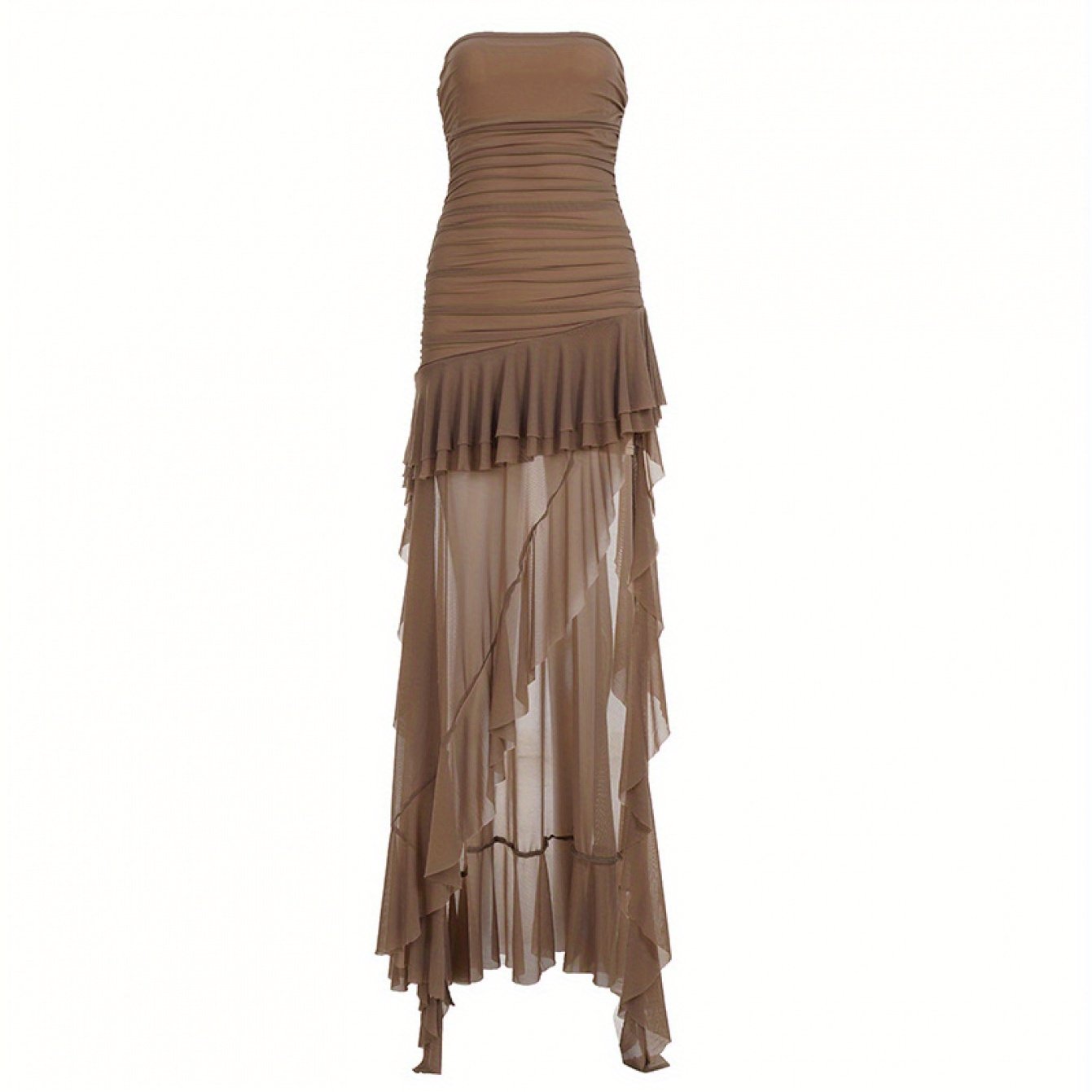 Sexy Mesh Bohemian Style Dress with Asymmetrical Hem And Irregular Pleated Strapless Skirt for Women
