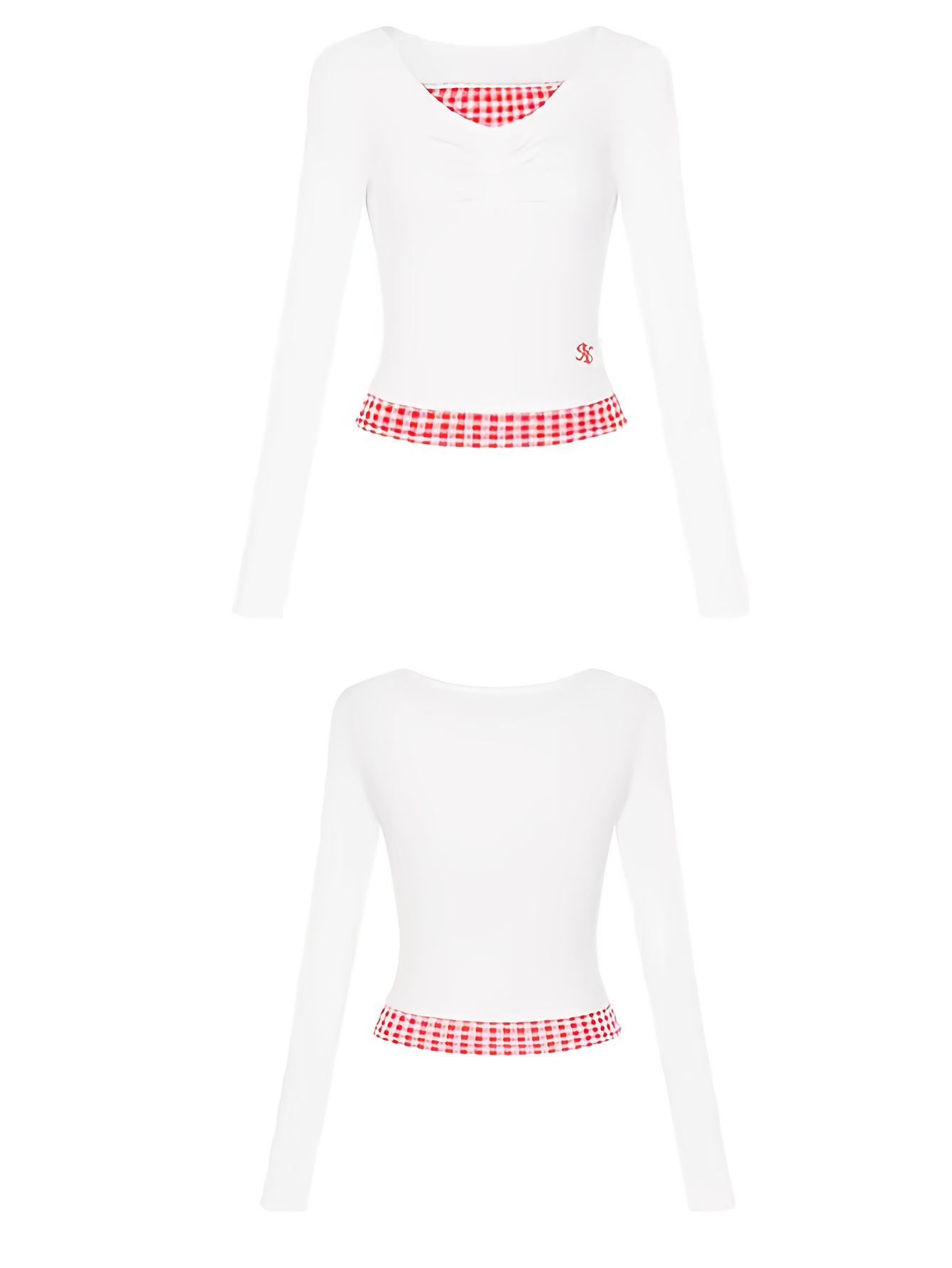 Women'S Slim-Fit V-Neck Long Sleeve T-Shirt - Red & White Checkered Color-Block Design, Cropped Length