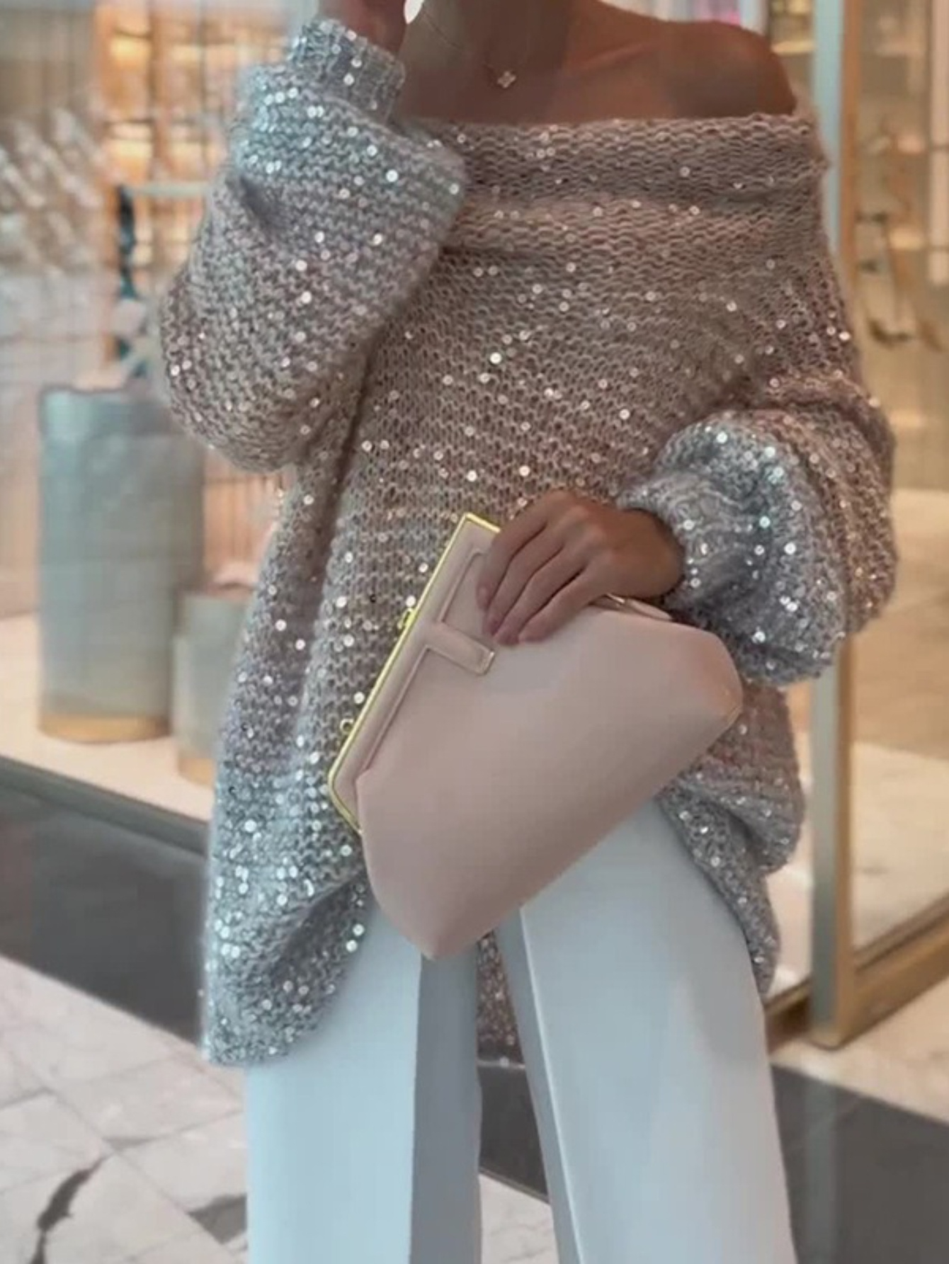 Women's Sparkling Off-the-Shoulder Sweater with Asymmetrical Sequin Sleeves - Winter Warm Loose-Fit H-Line Blazer-like Jacket